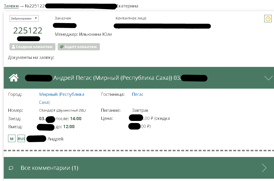 - Забронирован - от гостиницы получено подтверждение о бронировании