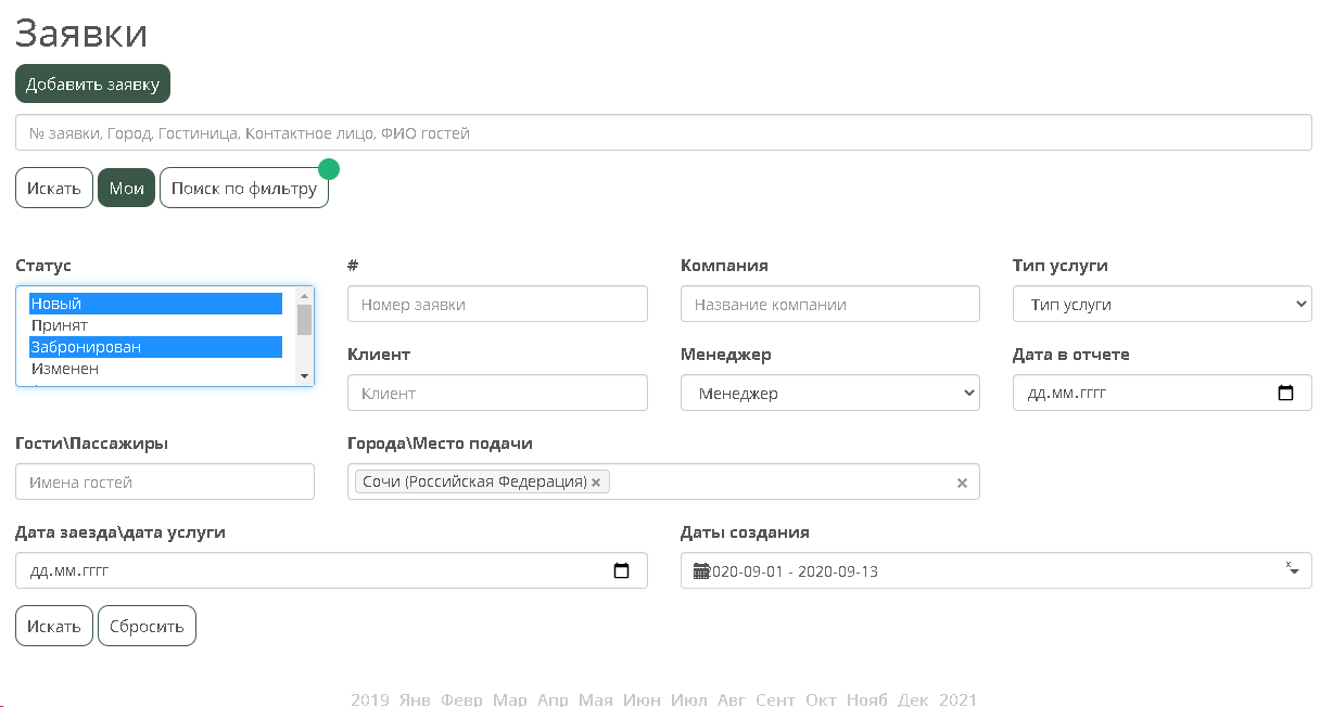 Фильтры позволяют искать заявки по нескольким условиям. Если выбран фильтр «Дата создания», то поиск осуществляется в рамках выбранного календарного месяца.