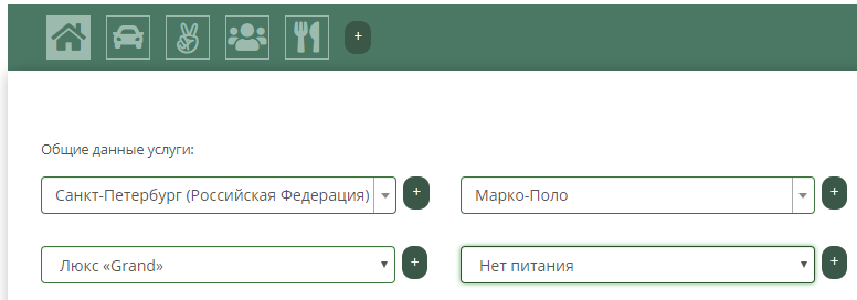 В форме услуги проживания помимо заполнения общих данных услуги проживания, доступно добавление новых города, места размещения, номера и типа питания.
