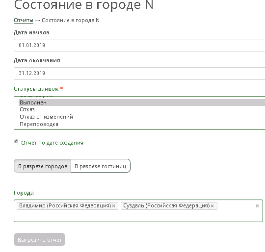 Так же есть параметры, позволяющие выбирать заявки по дате создания заявки, по дате заезда, с любыми статусами (статусы можно выбирать любые, в любом количестве через клавишу Ctrl)