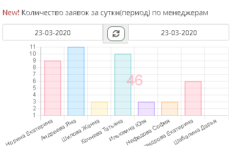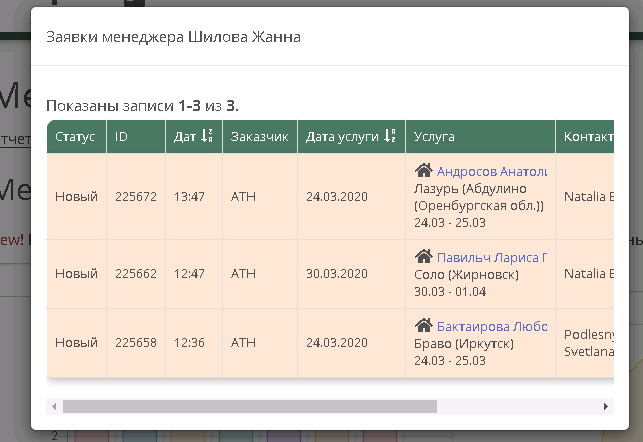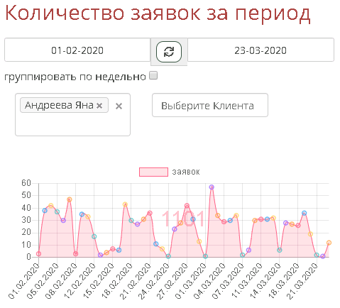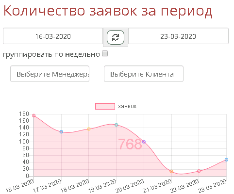 Например нажав на столбик с фио менеджера можно получить созданные им заявки в указанный период: