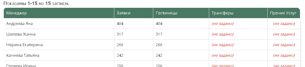 В отчёте показаны заявки с разбивкой по менеджерам и видам услуг:
