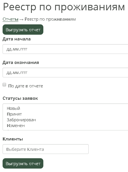 Отчёт формируется в реальном времени, генерируется в xlsx. Содержит заявки в указанном статусе только по Услугам проживание.