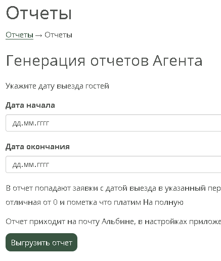 Отчёт специально созданный для бухгалтерии. Генерируется автоматически каждый 1 день месяца в 12:07 (период заявок - предыдущий месяц) и отправляется на почту Альбине, но может быть сформирован вручную на любые даты