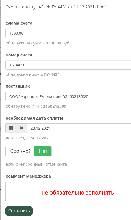 2. После загрузки счета в течении нескольких секунд счёт будет распознан и вам будет показана подсказка с данными счёта. Система распознаёт информацию из счетов (не в 100% случаев) и даёт подсказки, для облегчения заполнения информации по счёту в дальнейшем