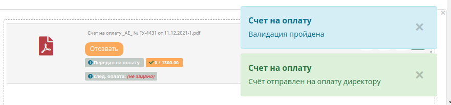 Будут показаны сообщения о передаче и обновлён список счетов. С этого момента в Заявках где прикреплён этот счёт(1 счёт может быть в нескольких заявках, везде данные будут одинаковы - это один и тот же счёт) и в списке счетов можно отслеживать статус счёта.