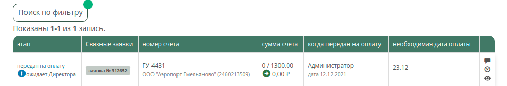 Как только счёт будет оплачен, передан в бухгалтерию, отозван бухгалтерией или директором - это сразу отобразиться в заявке\списке счетов: