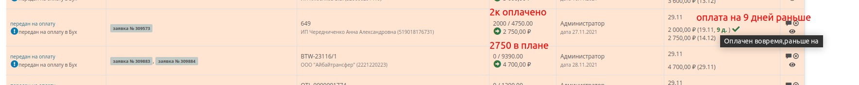 В списке видно какие счета планируется оплатить, какие оплачены, а какие не оплачены абсолютно.
