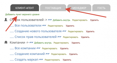 Для создания верхнего пункта меню необходимо выбрать для какого типа пользователя создается пункт и нажать на ссылку «Добавить пункт верхнего уровня»